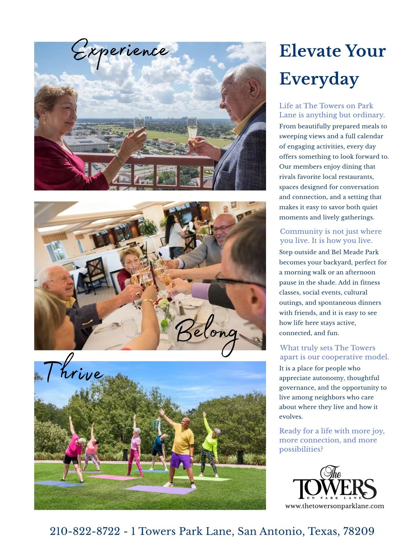 The Towers on Park Lane is San Antonio’s premier resort-style high-rise for active adults 55+ who desire affordable luxury living. Centrally located near prestigious Alamo Heights & Terrell Hills, residents enjoy the companionship and convenience of a neighborhood community along with a socially rich lifestyle, including multiple award-winning dining areas, scheduled transportation, a resident safety office, in-house housekeeping, and an on-site maintenance department. Embark on adventure in weekly outings and social mixers as well as dozens of interest groups and classes for every hobby, offered daily. It's high time to enjoy life and homeownership where carefree living is above it all.